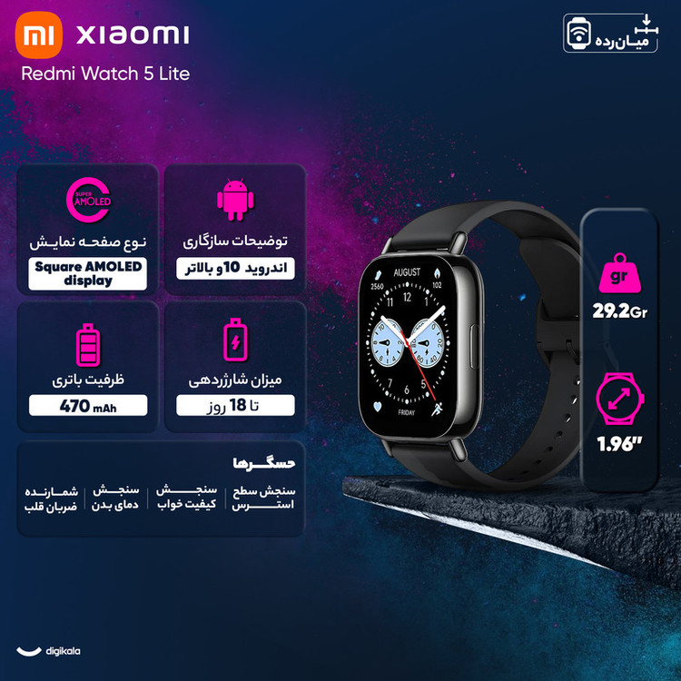 ساعت هوشمند شیائومی مدل Redmi Watch 5 Lite، ترکیبی هوشمندانه از طراحی مدرن، امکانات کاربردی و قیمت مناسب است که برای استفاده روزمره و ورزشی آقایان و بانوان طراحی شده است. این ساعت با سیستمعامل Xiaomi HyperOS و بلوتوث نسخه ۵.۳، تجربهای روان و سریع از اتصال به گوشیهای اندروید ۸ و iOS ۱۲ به بالا را فراهم میکند. یکی از ویژگیهای برجسته آن، قابلیت مکالمه از طریق بلوتوث است که به شما اجازه میدهد تا بدون نیاز به بیرون آوردن گوشی، تماسهای خود را پاسخ بدهید. صفحه نمایش AMOLED مربعی ۱.۹۶ اینچی با وضوح ۴۱۰×۵۰۲ پیکسل و تراکم ۳۳۲ پیکسل بر اینچ، تصویری شفاف و رنگهایی زنده به نمایش میگذارد. بدنه سبک ۲۹.۲ گرمی و بند سیلیکونی قابل تعویض، راحتی بیشتری را هنگام استفاده در فعالیتهای روزانه یا ورزشی به همراه دارد. همچنین این ساعت با مقاومت در برابر آب تا عمق ۵۰ متر و فناوریهای GNSS مانند GPS، Glonass و BeiDou، گزینهای مناسب برای ورزشکاران و علاقهمندان به تمرین در فضای باز است. باتری ۴۷۰ میلیآمپری آن نیز تا ۱۸ روز شارژدهی را در استفاده معمولی تضمین میکند. این ساعت، همراهی هوشمند و شایسته برای زندگی پرتحرک امروز است.